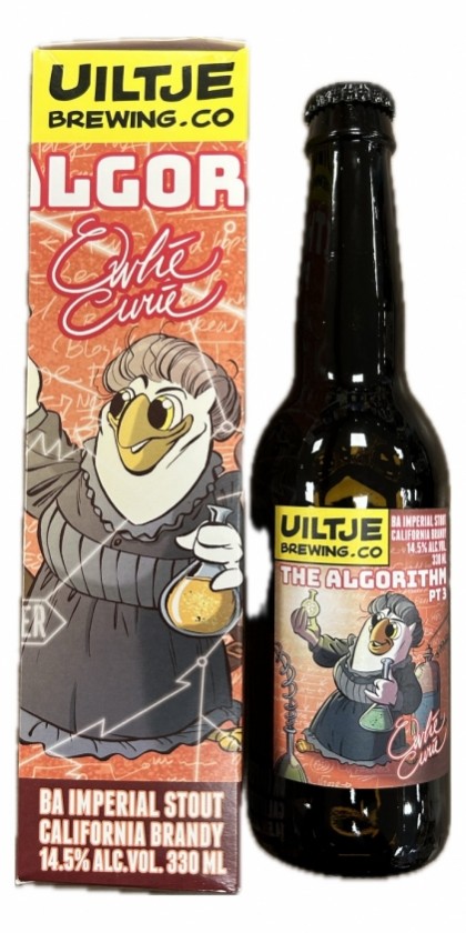 In 2022 was Algorithm Pt.1 binnen enkele seconden uitverkocht. In 2023 vloog Pt. 2 ook de deur uit. Nu in 2024 presenteren we met trots het epische slotstuk van onze blockbuster barrel-aged Imperial Stout trilogie: The Algorithm III. Deel I doorkruiste tijd en ruimte door Owlbert Einstein in Texas Bourbon vaten te laten rijpen. Deel II tartte de zwaartekracht door Owlsaac Newton onder te dompelen in Armagnac vaten. Deel III laat Owlie Curie trekken in California brandy vaten. Net als Owlie Curie is deze limited edition Imperial Stout levendig en boordevol smaak (maar gelukkig niet radioactief). Deze limited edition Imperial Stout verenigt vanille- en zoete fruittonen van Amerikaans eikenhout.
